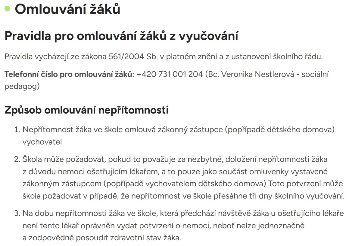 Veškeré omlouvání absencí přes jeden služební telefon sociální pedagožky, jež vede evidenci omlouvání žáků. Všechny děti a rodiče znají toto číslo z žákovské knížky, sociálních sítí nebo třídních schůzek.